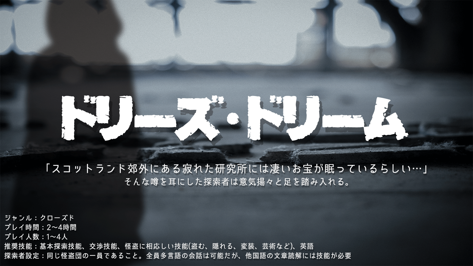 注意:同じ怪盗団の一員であること。全員他言語の会話は可能だが、文章読解には技能が必要。尚、研究所へお宝探索に行ってくれる探索者であれば怪盗団である必要はない。